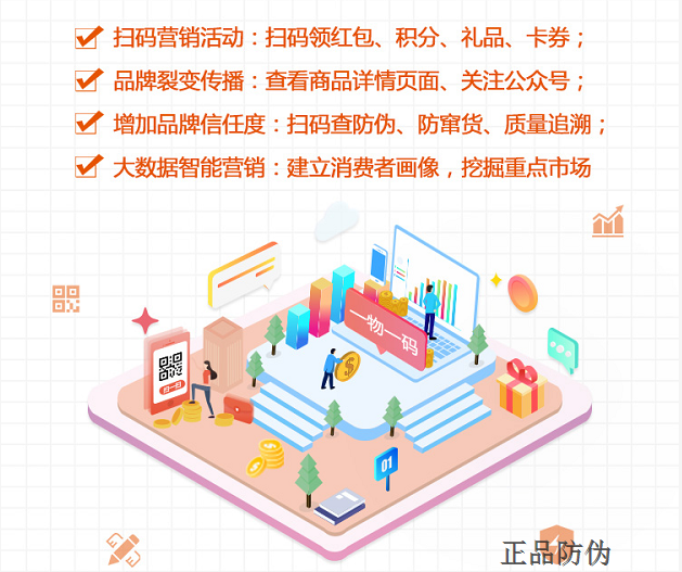 品牌发展,营销活动必不可少,正品防伪化妆品扫码红包营销系统提供标新立异的玩法,利用一物一码技术,为每一件商品赋予独一无二的二维码,以码为信息载体入口,建立线上线下的双向连接。消费者手机扫描二维码就能获悉产品信息,同时领取红包、积分、卡券、流量、实物礼品等。